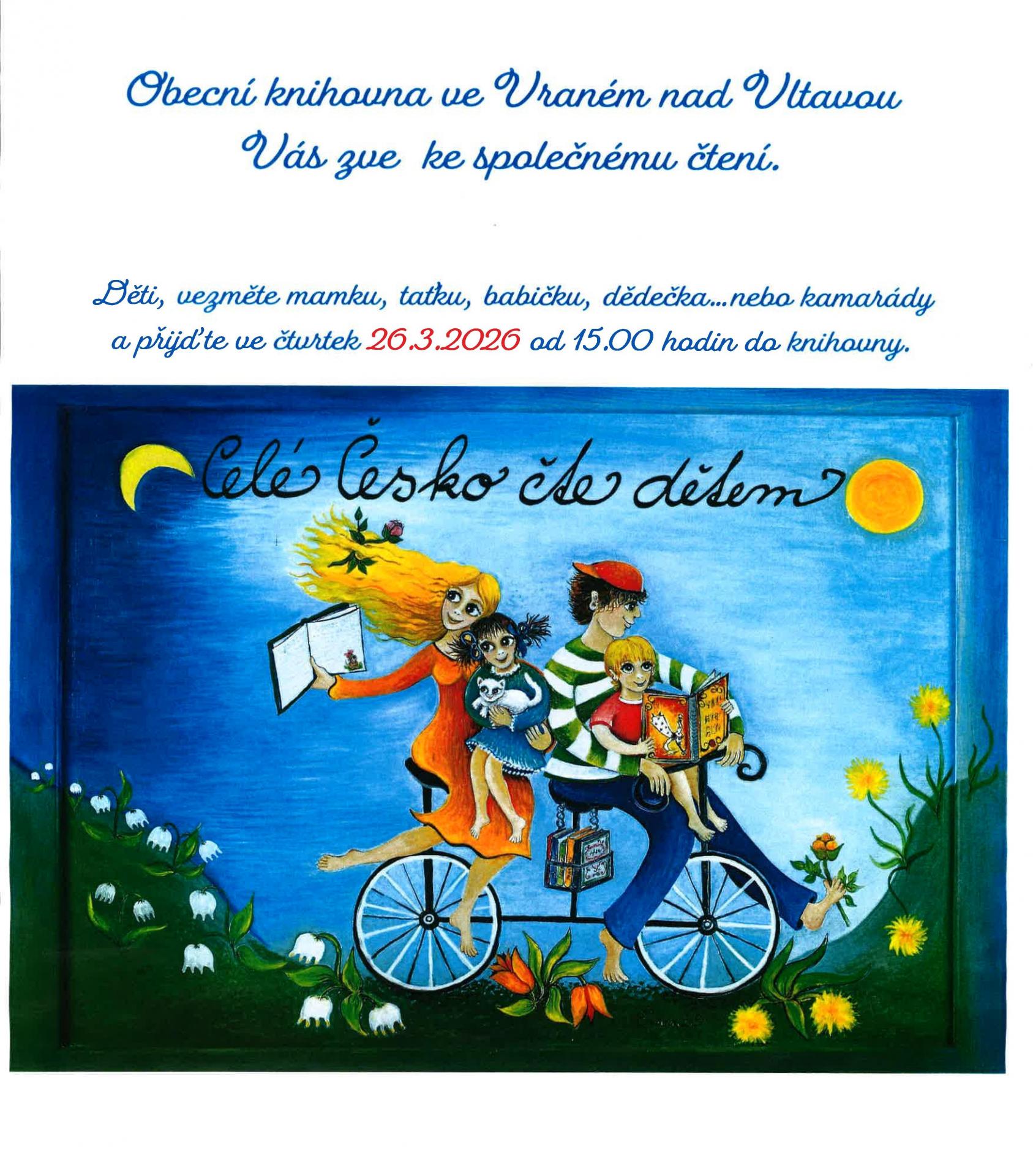 Obecní knihovna ve Vraném nad Vltavou Vás zve ke společnému čtění v rámci akce Celé Česko čte dětem - čtvrtek 26. 3. 2026 od 15 hodin