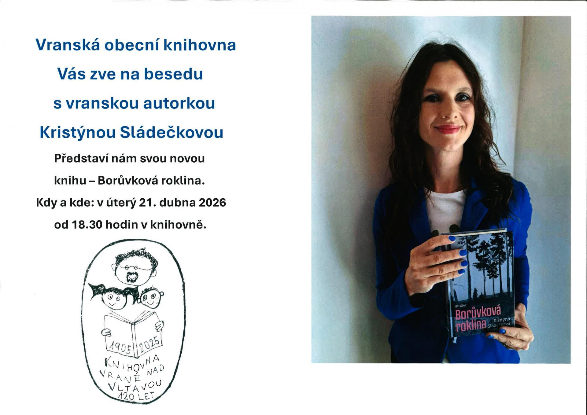 Obecní knihovna ve Vraném nad Vltavou Vás zve na besedu s vranskou autorkou Kristýnou Sládečkovou - úterý 21. 4. 2026 od 18:30