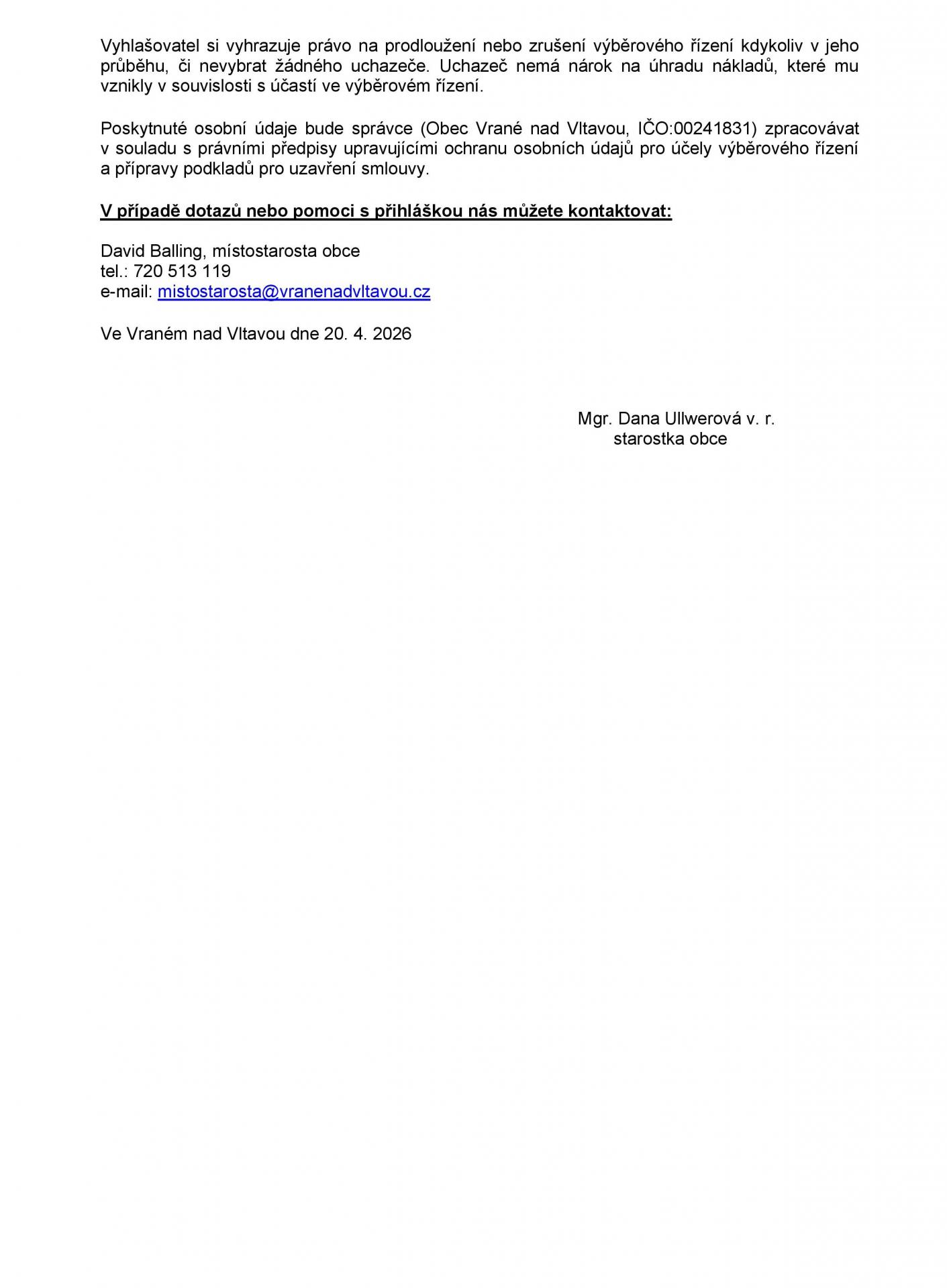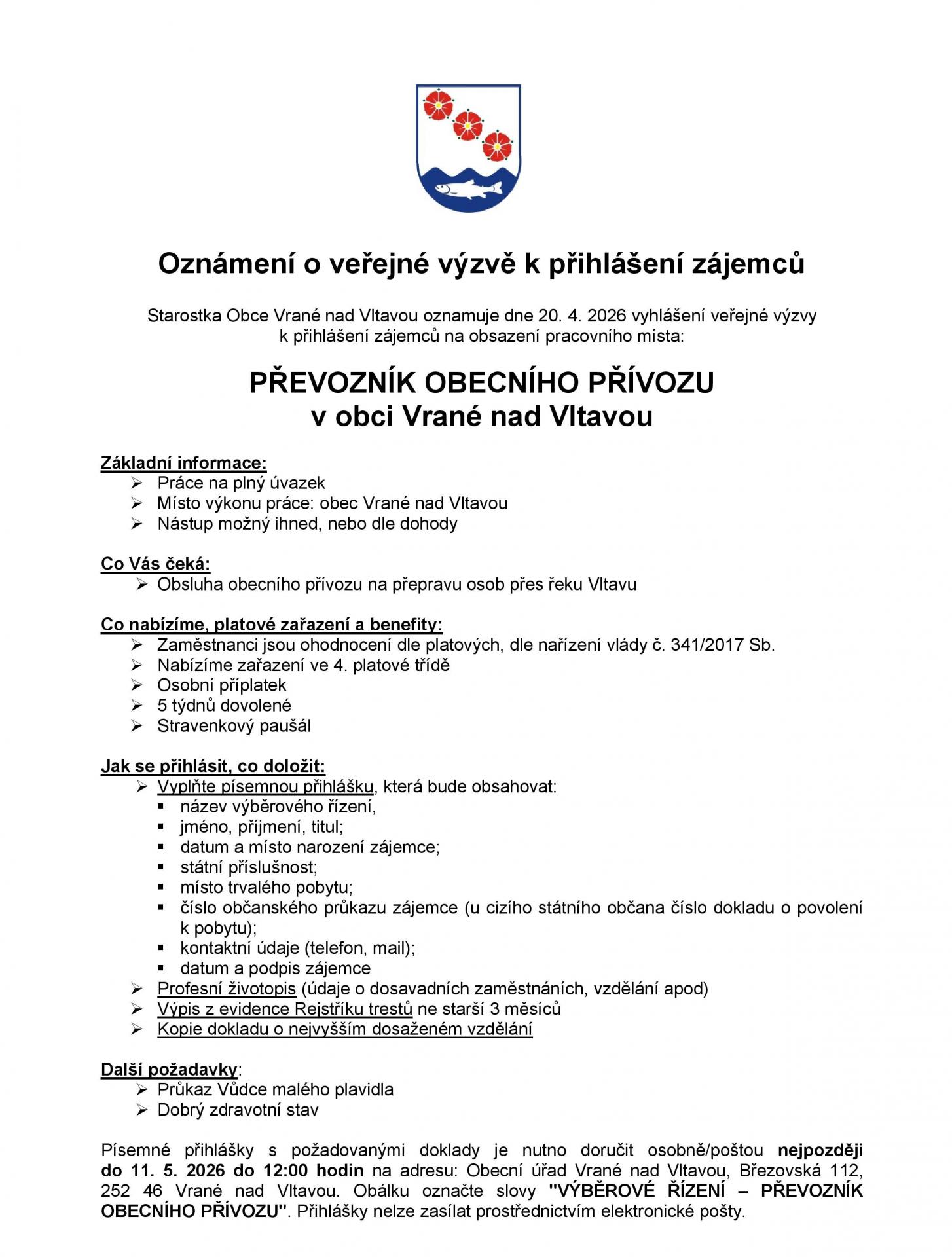 Oznámení o veřejné výzvě k přihlášení zájemců - Převozník obecního přívozu v obci Vrané nad Vltavou