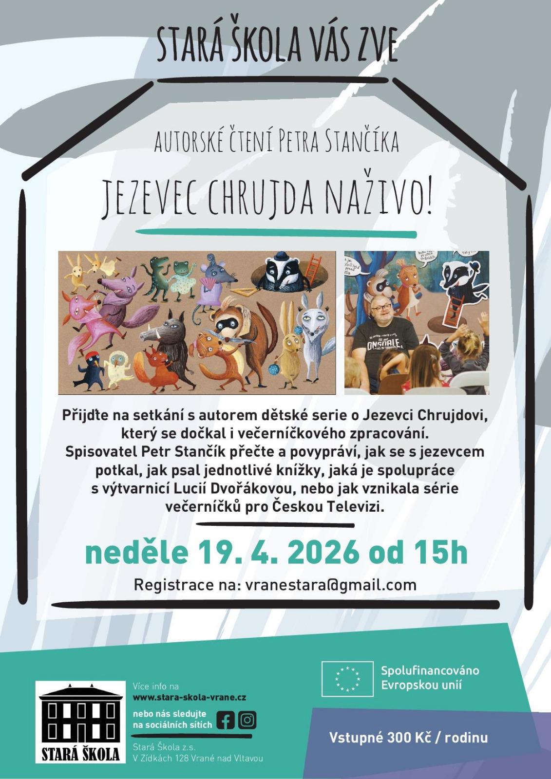 Stará škola Vás zve na autorské čtení: Jezevec Chrujda naživo - neděle 19. 4. 2026 od 15:00 hodin