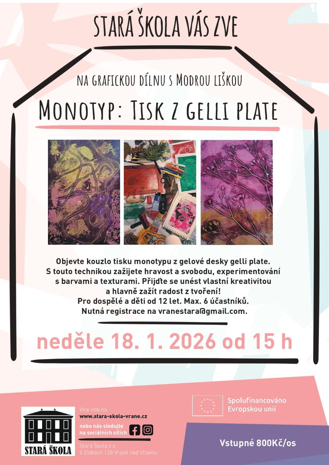 Stará škola Vás zve na grafickou dílnu Monotyp: tisk z gelli plate - neděle 18. 1. 2026 od 15 hodin