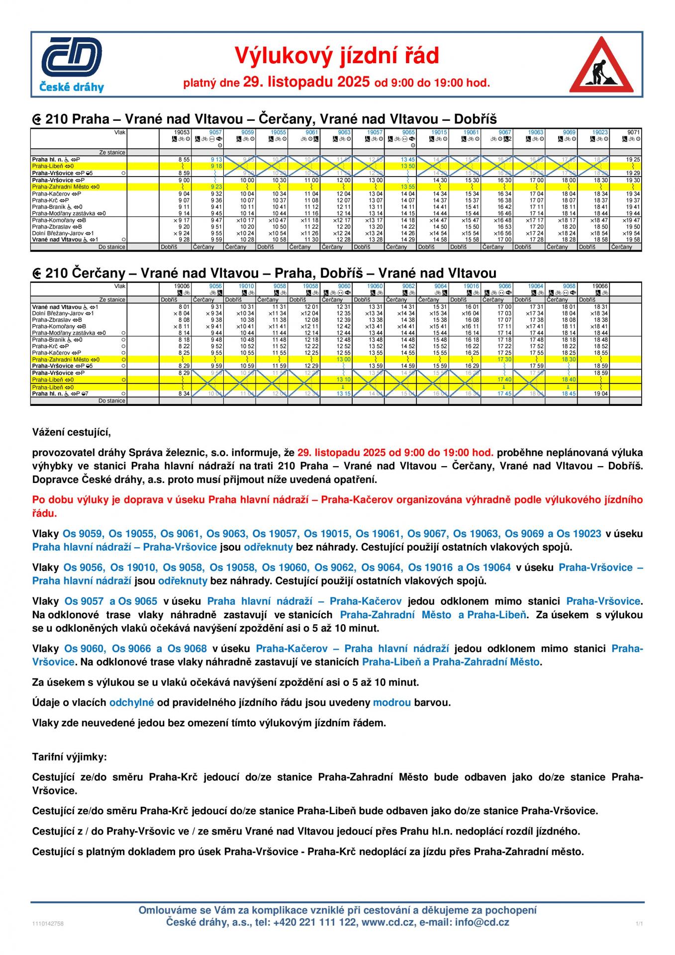 Výluka na železniční trati č. 210 v sobotu 29. 11. 2025 v úseku Praha hl. n. - Praha-Vršovice
