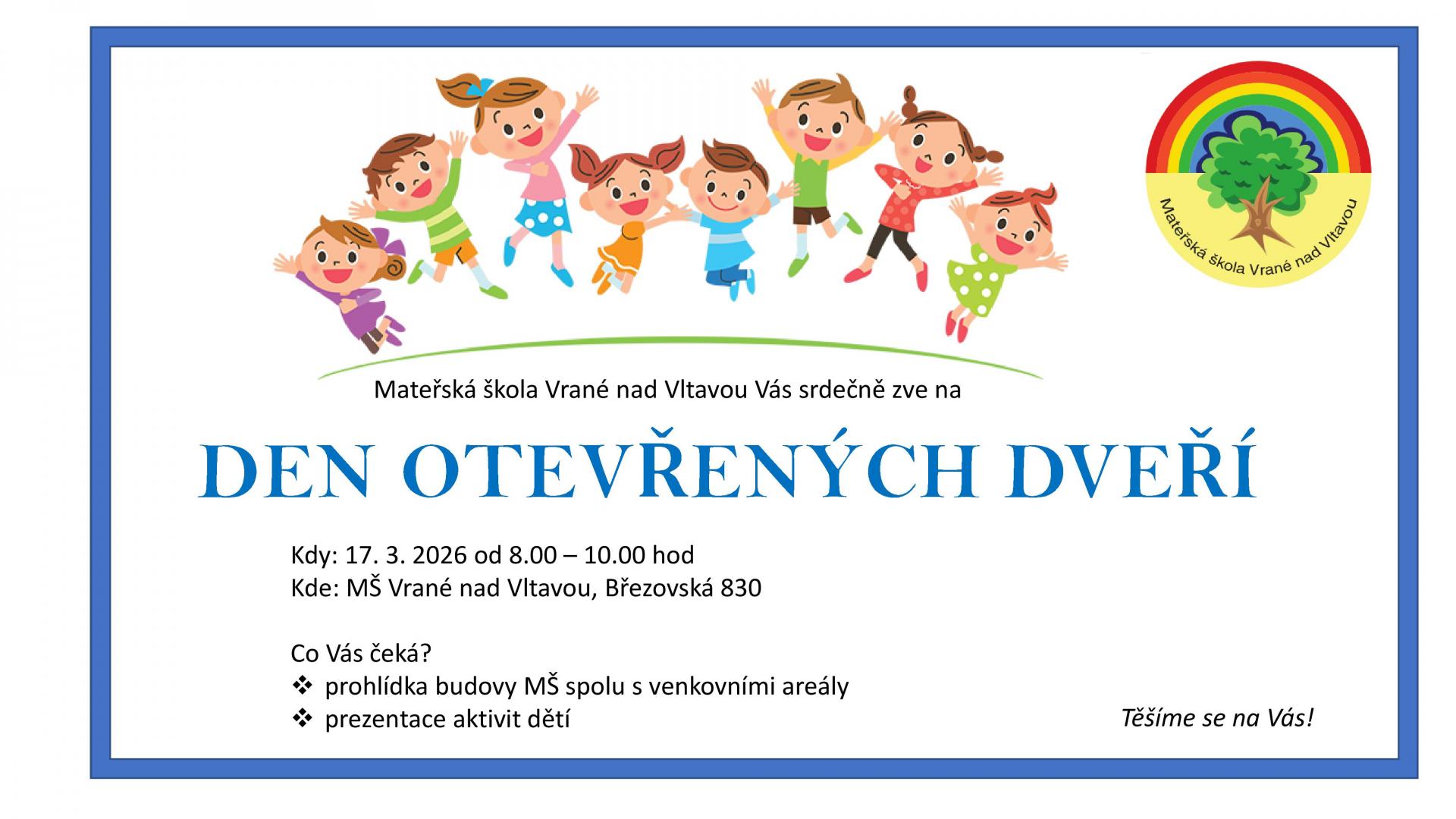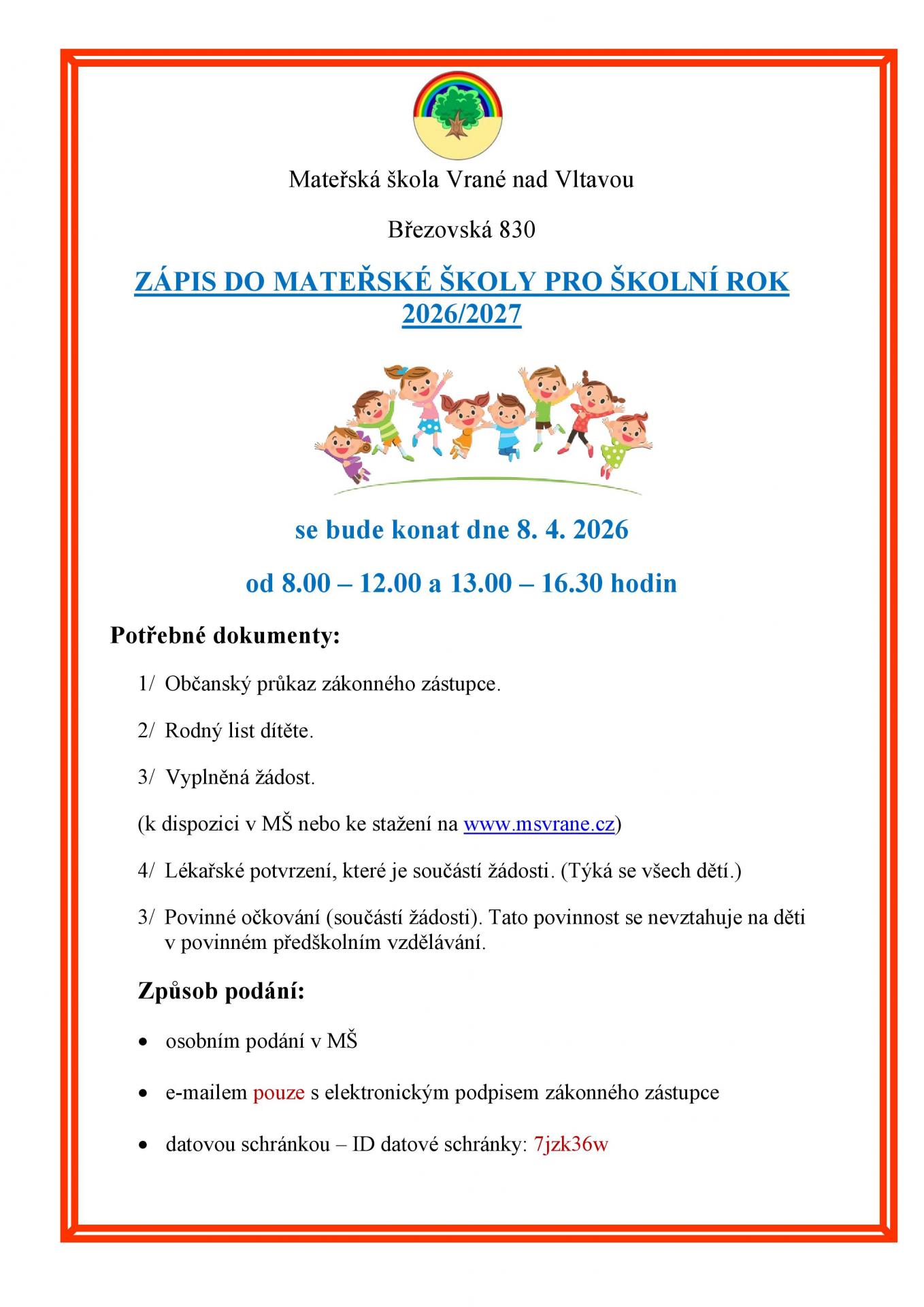 ZÁPIS DO MATEŘSKÉ ŠKOLY PRO ŠKOLNÍ ROK 2026/2027 a DEN OTEVŘENÝCH DVEŘÍ