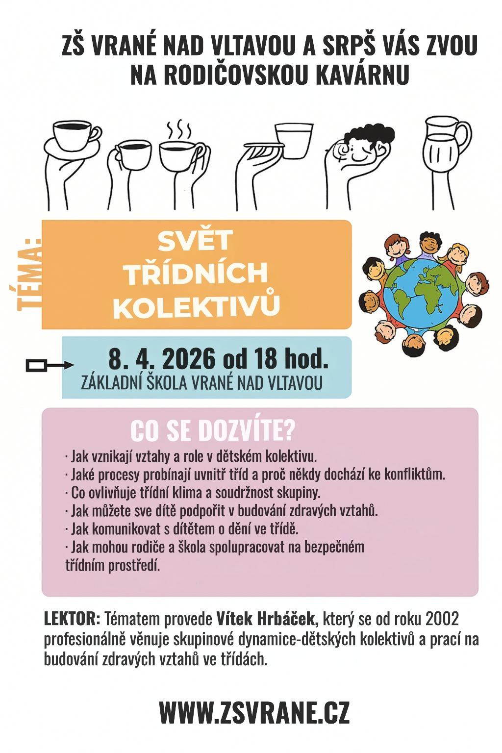 ZŠ Vrané nad Vltavou a SRPŠ Vás zvou na rodičovskou kavárnu - středa 8. 4. 2026 od 18 hodin (změna termínu)