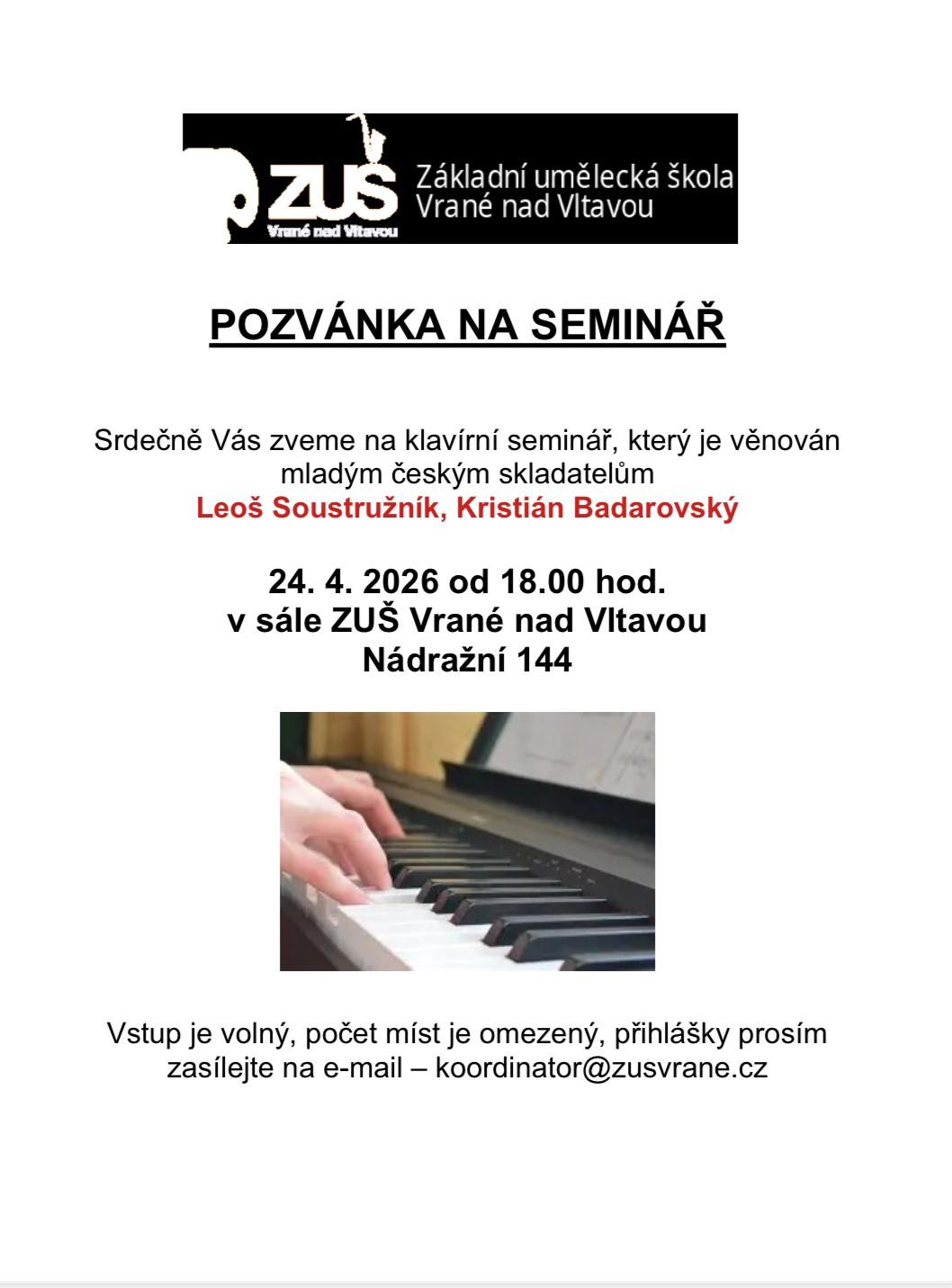 ZUŠ Vrané nad Vltavou Vás zve na klavírní seminář - dnes 24. 4. 2026 od 18:00 hodin